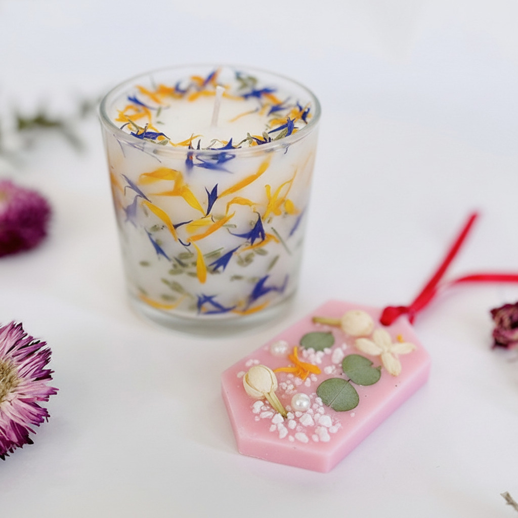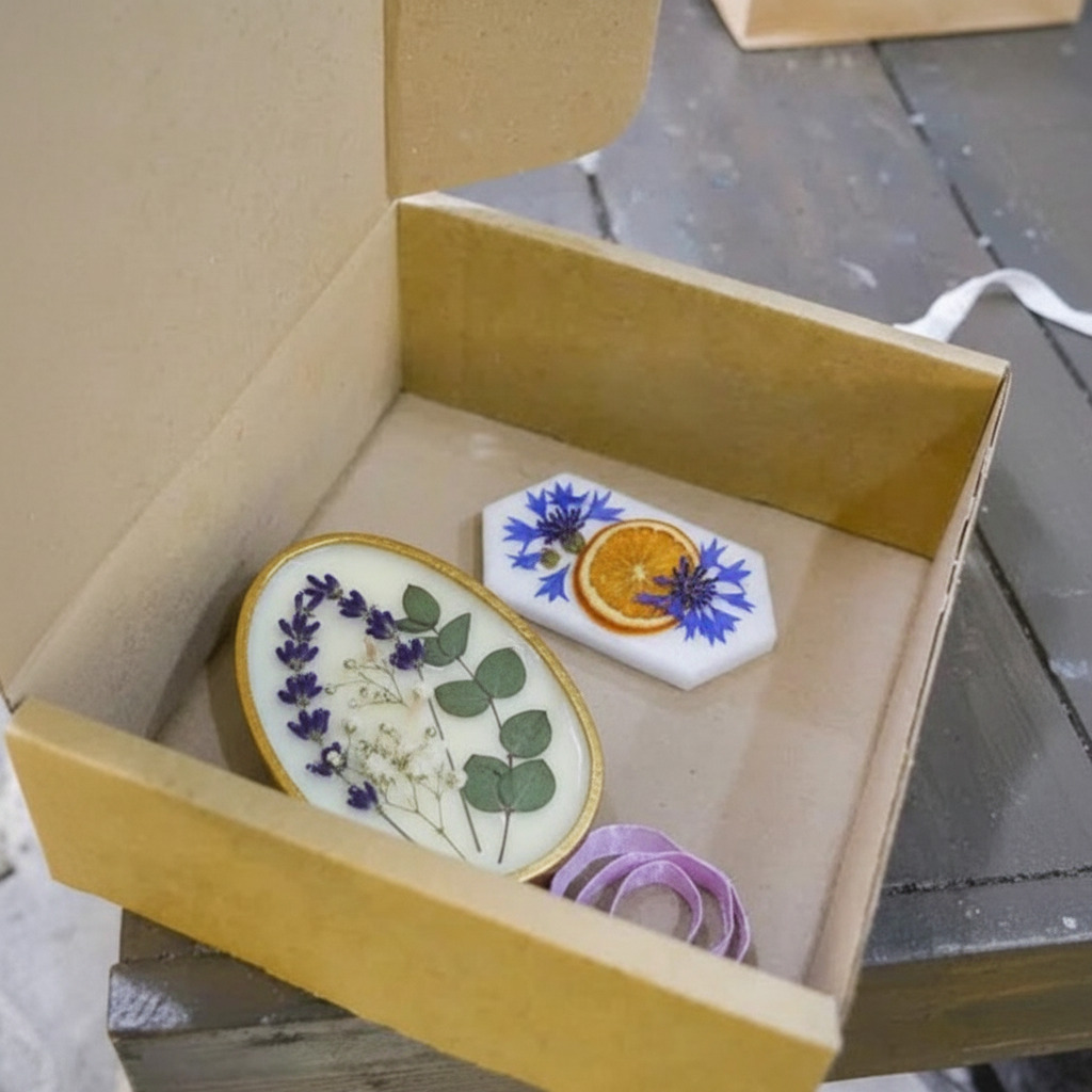 Каждый вариант дополняется ароматным флорентийским саше. А также вы создадите изысканное мыло, украшенное цветами, которое упакуете в крафтовую картонную коробку.