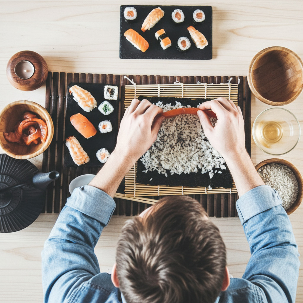 - Техники: лепка суши, оформление гунканов, баланс вкусов