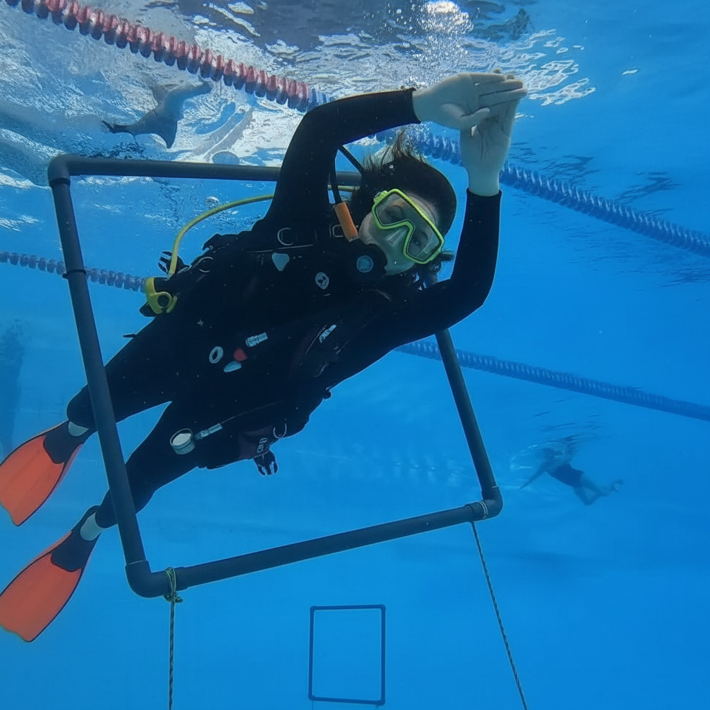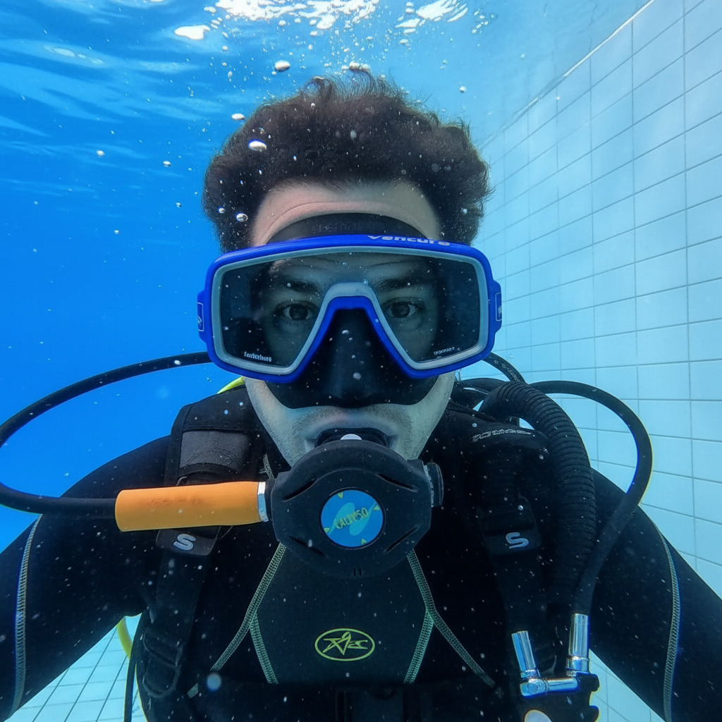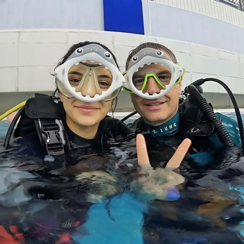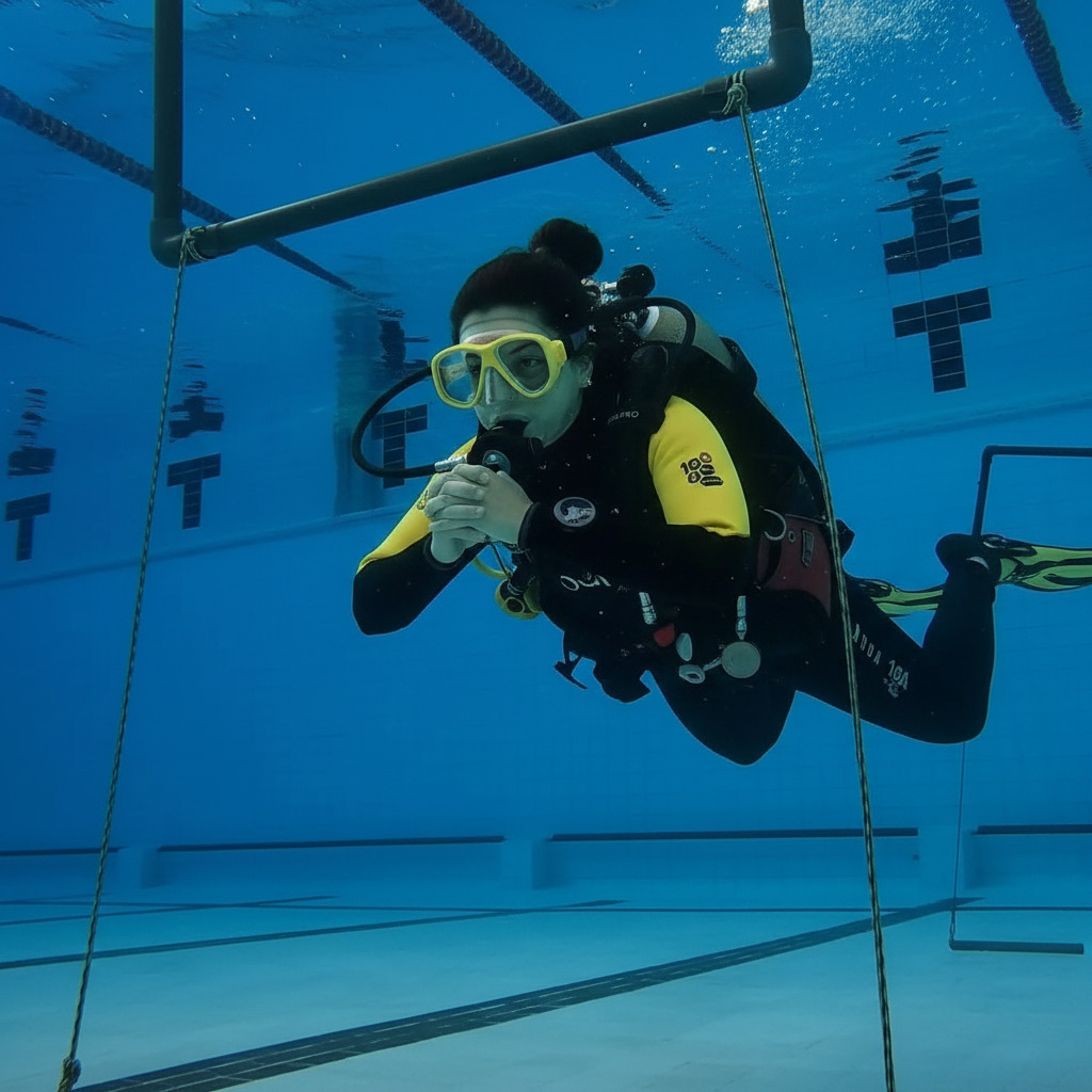 - Практика: 5 занятий в бассейне отрабатываются все ключевые навыки: дыхание под водой, очистка маски, плавучесть, аварийные процедуры.
