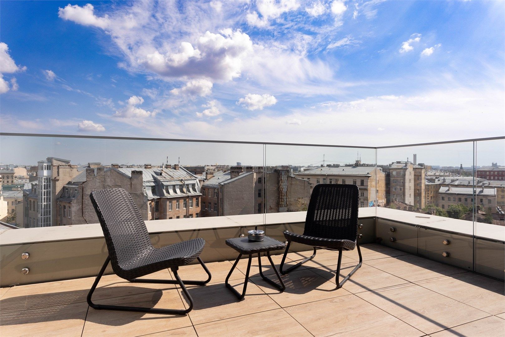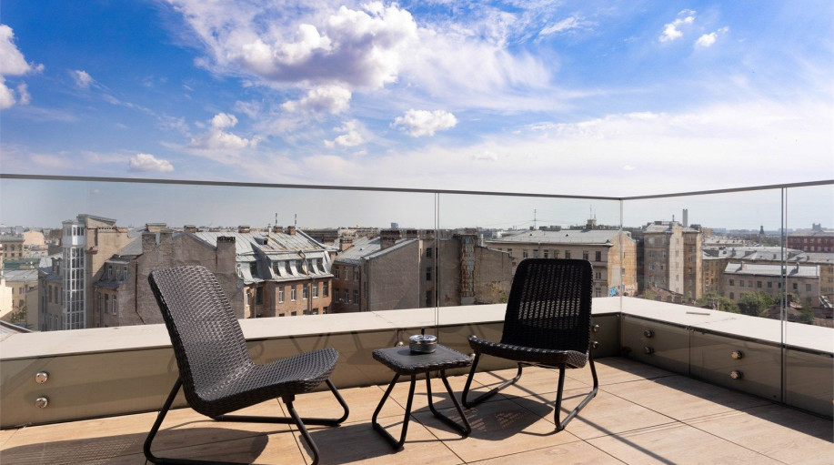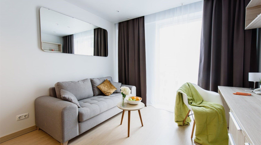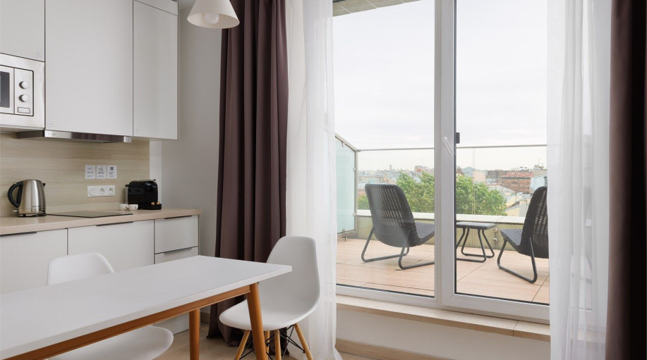 Апартаменты категории "Терраса Люкс" площадью от 48 до 60 кв.м. Главной особенностью данного номера является наличие большой террасы с прекрасным панорамным видом на город. На террасе есть мебель для отдыха. Номер двухкомнатный идеально подходит для размещение семьи. Терраса Люкс имеют удобное зонир..