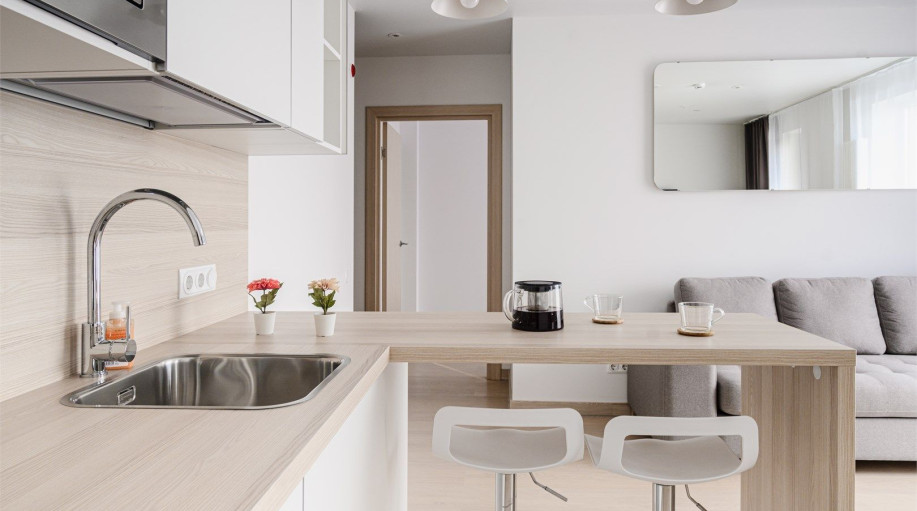 ✔ кухню-гостиную с раскладным диваном и обеденной зоной.